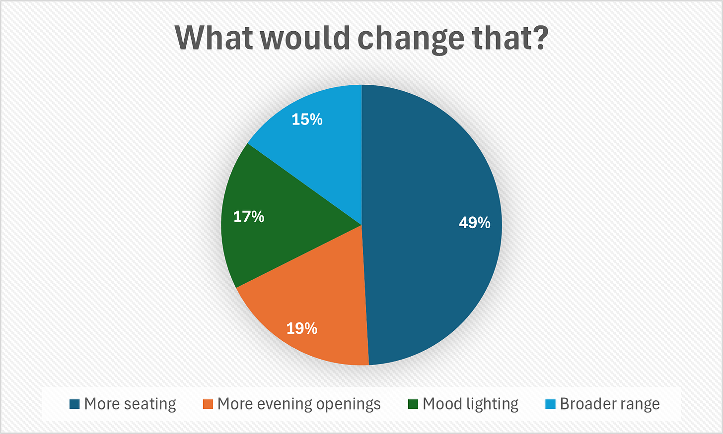 So it is useful to know that, although mood lighting and further expanding our drinks list are on our agenda, finding a way to increase capacity should be our priority.